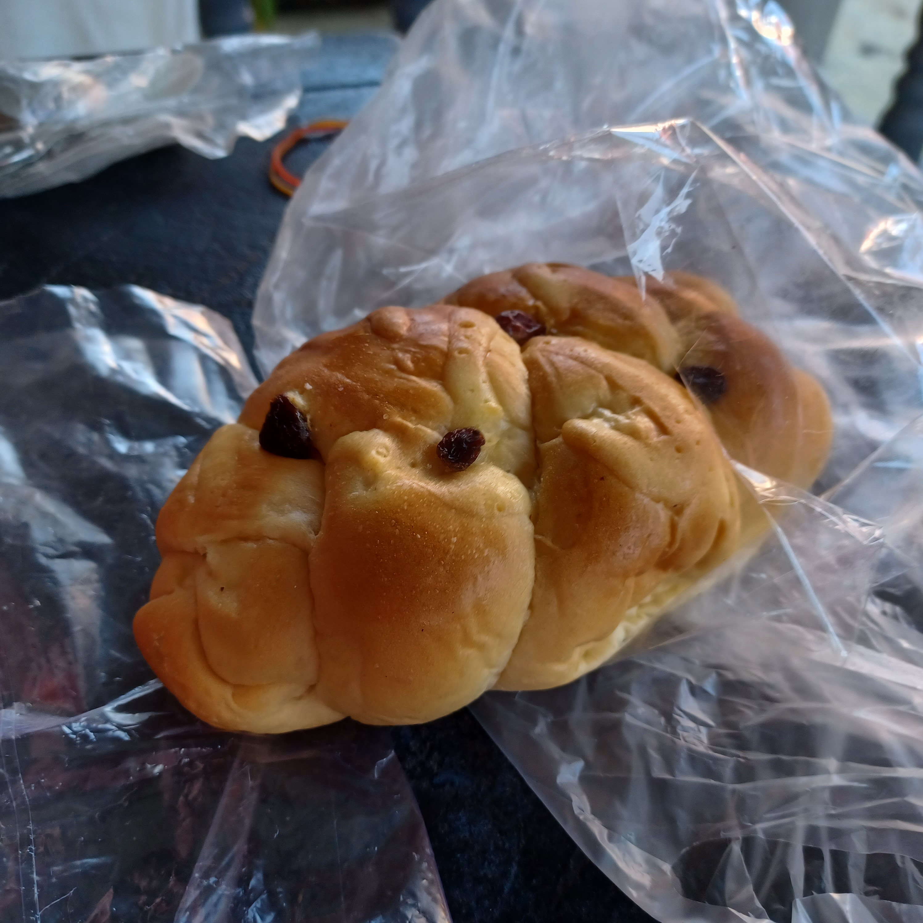 Petit déjeuner... morceaux de pastèque, et gâteau acheté à la bakery, un gâteau aux raisins où il n'y a que trois malheureux raisins en décoration sur le dessus et aucun à l'intérieur.