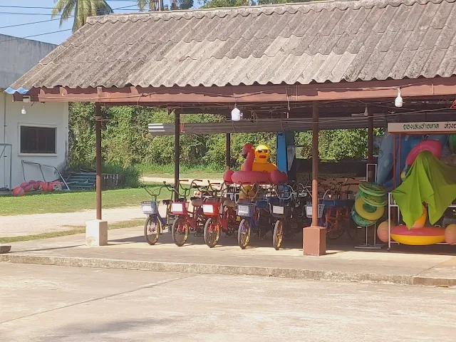 Quelques mètres plus loin, je croise un homme à bicyclette, harnaché presque comme un cosmonaute. Il essayait d'acheter une glace. Son accoutrement me fait tellement rire. On fait connaissance, il est Canadien, il s'appelle Luc (comme Luc Plamondon, lui dis-je !), il habite près d'Ottawa, et il parle parfaitement le français, du Canada.. Il voyage en Thaïlande à vélo. Il vient d'arriver à Bankrut, il a roulé depuis Prachuap, et il cherche un hôtel.